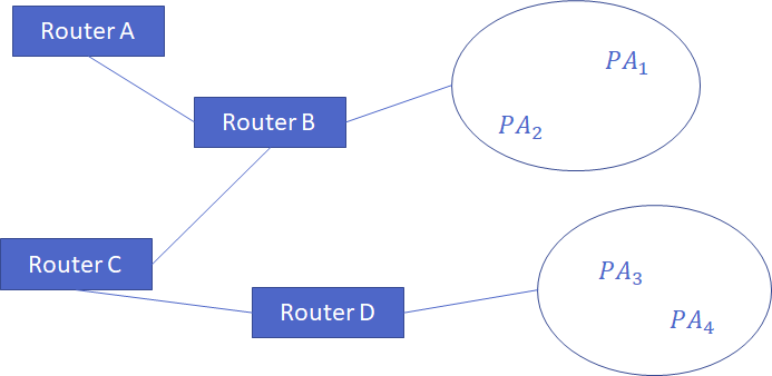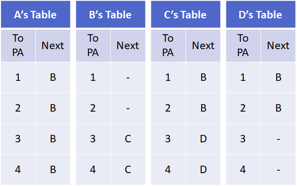 每個 router 會維護一張表。上面不是記去每個 paging area 要怎麼走的詳細資料,而是類似 gateway 的概念,記的是去哪個 paging area 從當前的 router 走的話下一站要走到哪裡。在這裡記的是 paging area 是因為如果是記 router 的話,數量太多了,不可能都放。