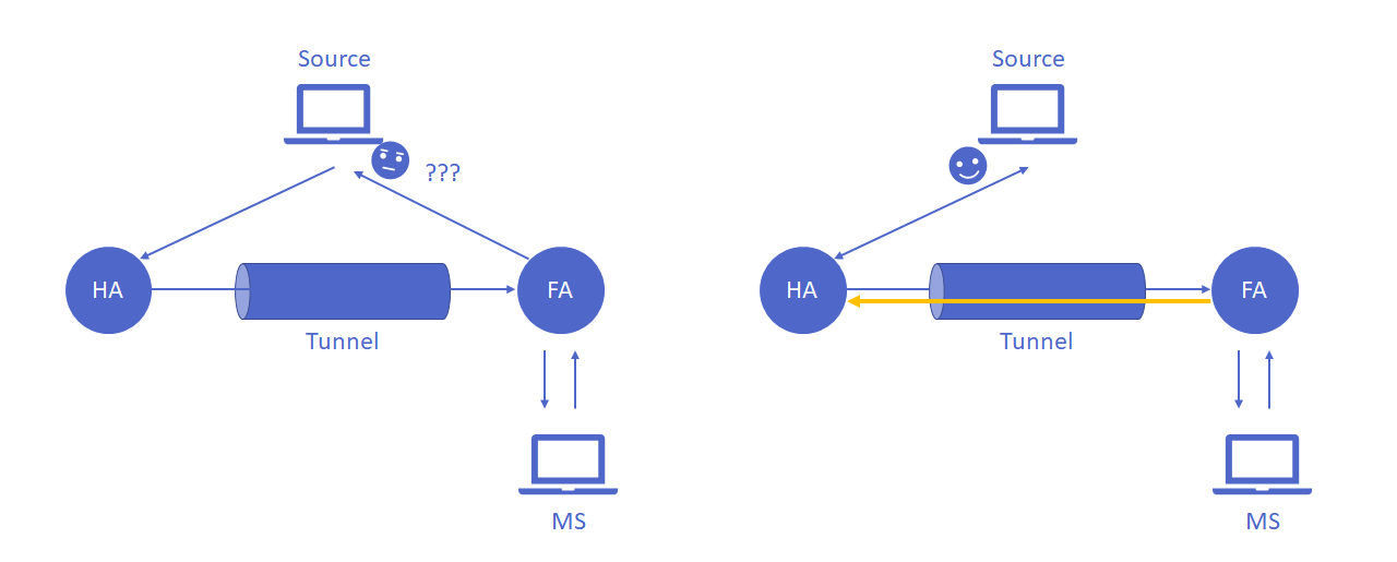 以上圖左邊為例,對要傳給你的 source 來說,你直接從 FA 傳回給它它會不知道你是誰(它認為它是跟 HA 通訊,所以不知道你 FA 是誰)。解決方法為 reverse tunneling,FA 還是要走反方向回去 HA。所以在這個問題裡,不可避免的要繞遠路。