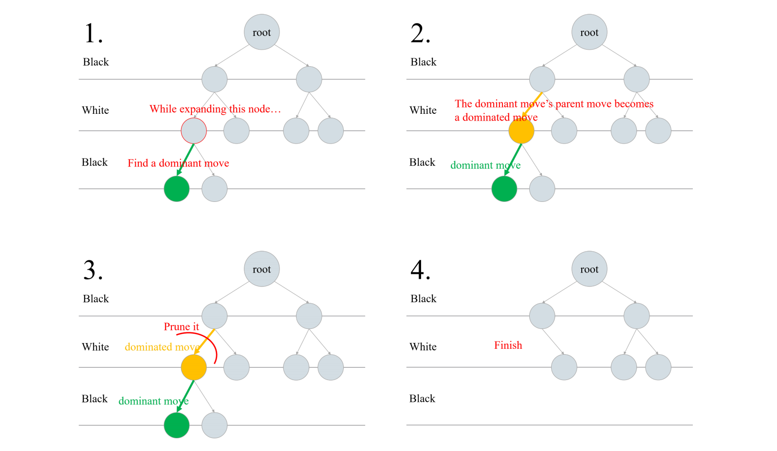 This idea combines the concept "induction" in game theory. Assume the opponent is rational, while running MCTS, if we can confirm a move dominate the game, then, by induction, the opponent won't pick up its parent move. Therefore, we can prune its parent node to improve the efficiency of MCTS.